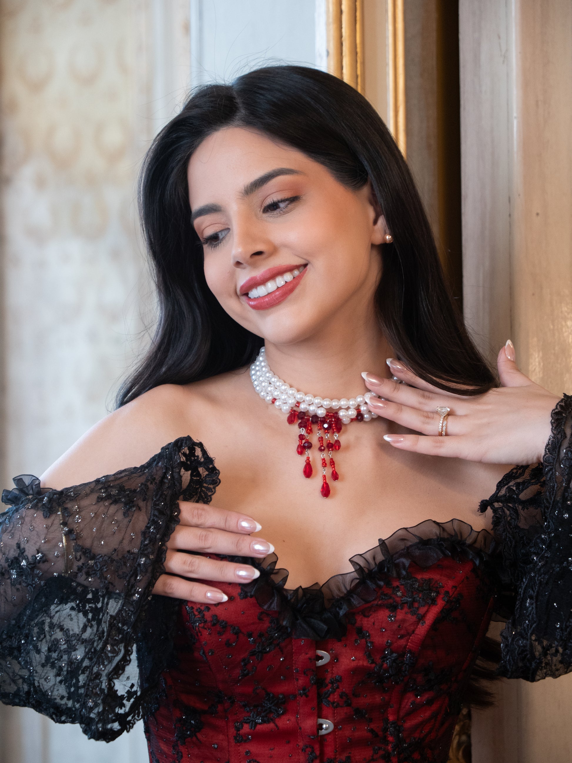 Un look oscuro, seductor y lleno de misterio para conquistar la noche de Halloween. El corset rojo con encaje negro aporta elegancia y sensualidad, mientras que los accesorios completan el aura irresistible de la reina de la oscuridad.