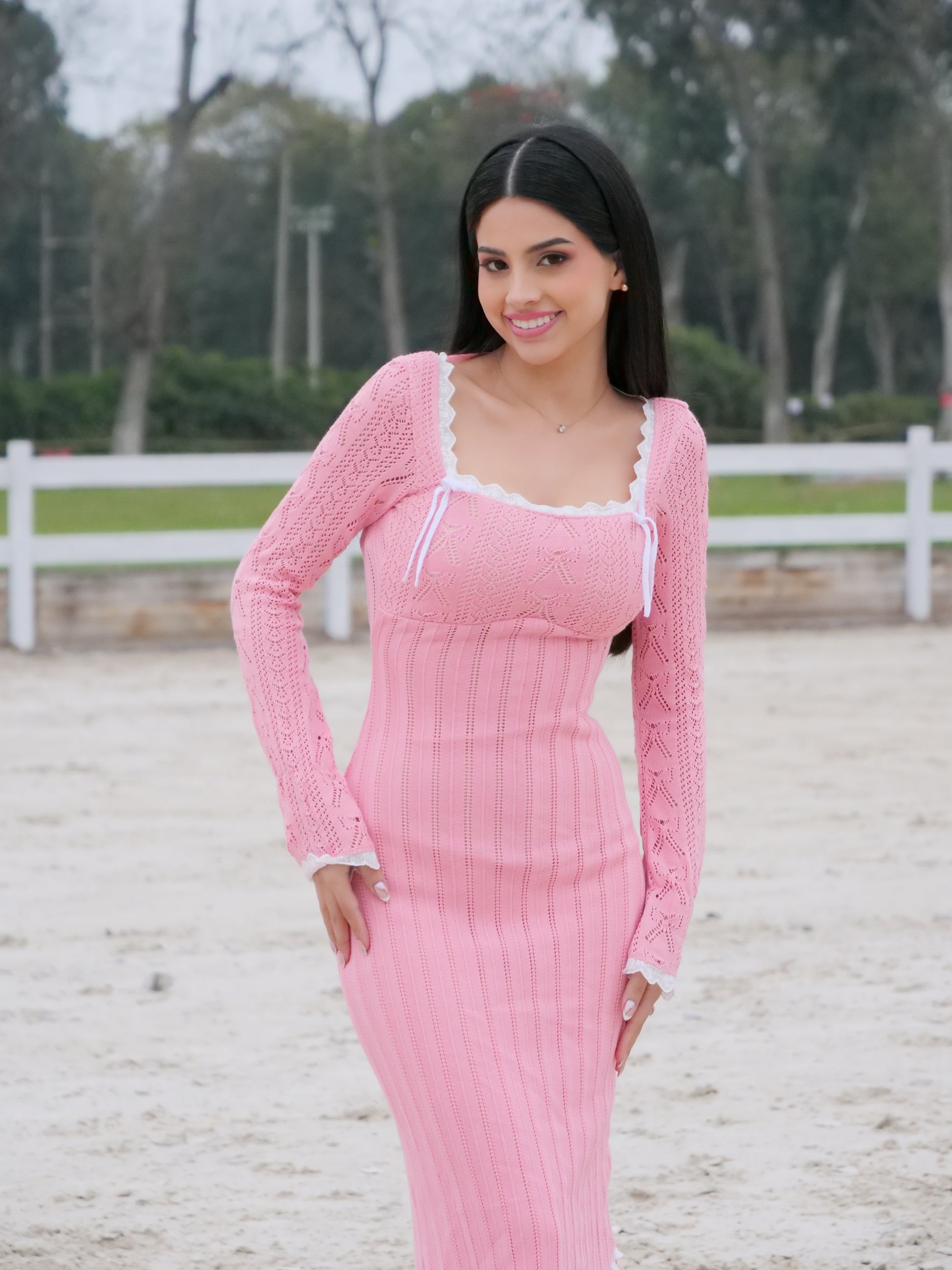 El Epiphany Dress se tiñe de dos colores en sus versiones rosa y celeste. Tejido con delicadeza, se convierte en un lienzo etéreo donde cada detalle habla de feminidad y renacimiento.